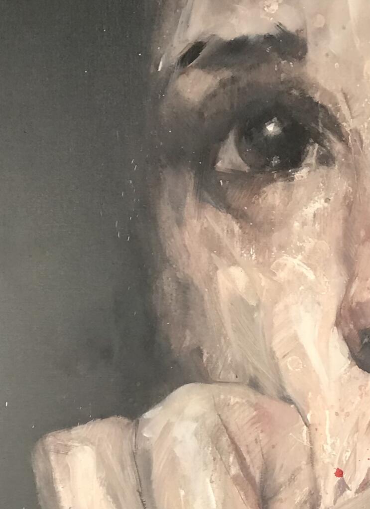 Cette œuvre appartient à une série de tableaux consacrés au transhumanisme, en tant que philosophie et projet ayant pour but d'augmenter l'être humain et d'en faire une espèce de machine ultra-sophistiquée qu'on peut améliorer et réparer à l'infini. La figure humaine a tendance à disparaître derrière la technologie, chaque organe, chaque parcelle du corps devient comme une pièce de puzzle qu'on peut recombiner à l'infini. Ici, la "Marche du Progrès" montre un homme en mouvement, conquérant : c'est toute l'ambiguïté du progrès technique et scientifique, qui se présente comme quelque chose de désirable, qui va de l'avant, mais au risque d'affaiblir la vraie nature, organique, de la condition humaine.Cette œuvre est réalisée en technique mixte sur toile et combine photographie, composition numérique et peinture à l'acrylique (glacis et carrés en relief). Il s'agit d'une pièce unique. Elle est encadrée en bois noir (dimensions totales : environ 81 x 61 x 3,5 cm)
