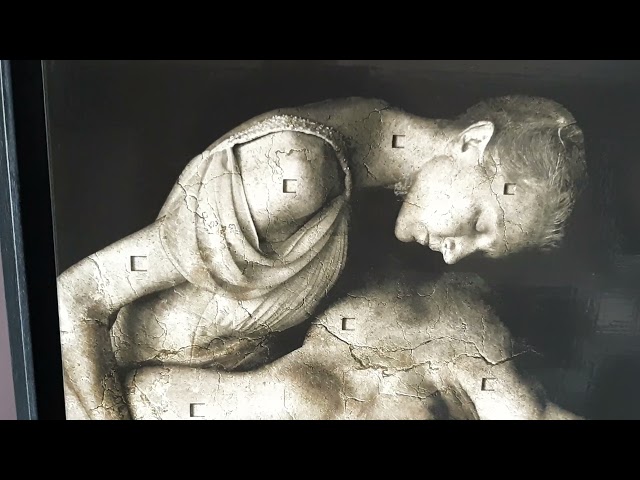 "To Lose my Life" appartient à une série de trois œuvres consacrées à la fin de l'histoire de Romeo et Juliette, lorsque les deux amants se retrouvent dans une situation confuse où la mort est simulée par un philtre avant d'advenir pour de vrai. Ici, Juliette s'est réveillée du sommeil où elle était plongée et découvre Romeo sans vie à côté d'elle ; elle le prend sur ses genoux, comme dans une Pietà, pour déplorer sa mort, dans un ultime geste de tendresse.Cette œuvre est réalisée en technique mixte sur toile. Elle combine photographie, art digital et peinture à l'acrylique (glacis laqués et carrés en relief), il s'agit d'une pièce unique et elle est accompagnée d'un certificat d'authenticité. Le tableau est encadré en bois noir (dimensions : 69 x 56 x 3,5 cm)