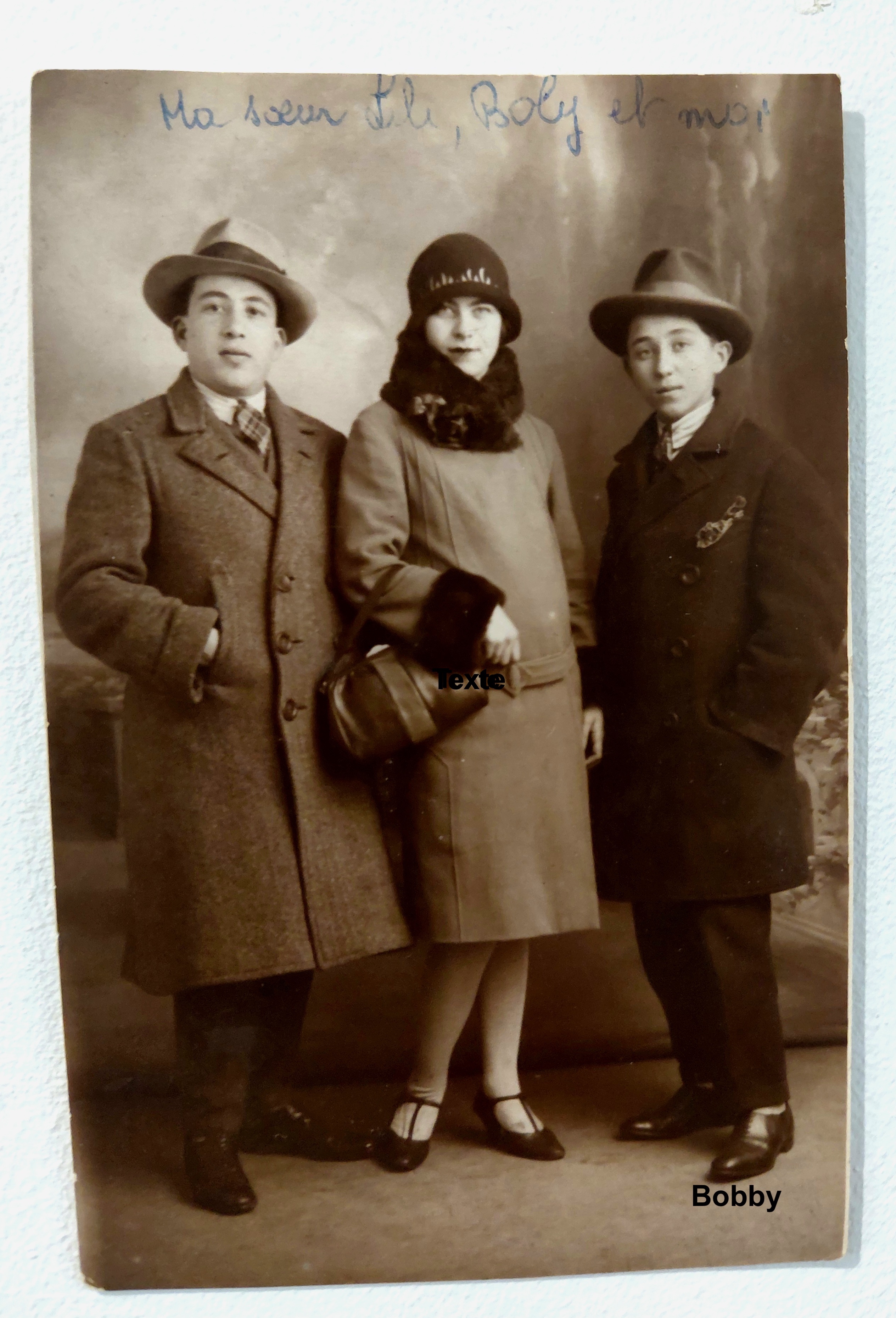 Une biographie assez mince. De lui, il reste une photographie - où il pose en grande tenue, comme il était coutume à l’époque, en compagnie de sa soeur Lili, ma grand-mère, et de son frère ainé. De ses productions artistiques, une gouache, un dessin ou même un croquis esquissé à la va vite, on n’a jamais rien retrouvé. Non, rien de rien. Juste la photo, et sa légende. Celle entendue lorsque j’étais enfant : « Oncle Boby serait devenu un très grand peintre. Il avait du talent, Berthe Weill l’avait reconnu… », mais que j’avais oubliée, et qui m’est revenue…